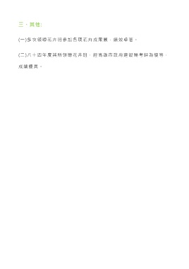 三、其他: (一)多次領導花卉班參加各項花卉成果展,績效卓著。 (二)八十四年度其所領導花卉班,經高雄市政府建設局考評為優等, 成績優異。