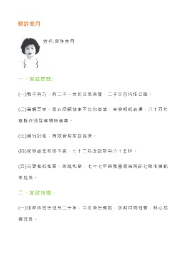 蔡許美月 姓 名 :蔡許美月 一、家庭管理: (一)教子有方,育二子一女約品學兼優 ,二子目前均任公職。 (二)事親至孝,悉心照顧健康不佳的婆婆,曾受報紙表場,八十四年 獲縣府頒發孝親楷模獎。 (三)實行計帳,有效管理家庭經濟。 (四)家事處理有條不紊,七十二年改建新宅八十五坪。 (五)夫妻相敬如賓,家庭和樂,七十七年榮獲臺灣省南部七縣市模範 家庭獎。 二、家政指導: (一)加家政班任班長二十年,目前兼任義指,按期召開班會,熱心指 導班員。
