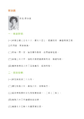 李洪貴 姓 名 :李洪貴 一、家庭管理: (一)孝順公婆(公七十八、婆七十四)、愛護姑叔、善盡長媳之責, 三代同堂,家庭美滿。 (二)育有一男一女,皆受專科教育,長男留鄉從農。 (三)結婚二十八年,協助夫婿經營農業有成,相處和睦。 (四)農業專業收入年二百多萬元,經濟充裕。 二、家政指導: (一)參加家政班二十六年。 (二)擔任班長八年、義指六年,領導有方。 (三)協助推展農村文化發展獲省級一、二名(二年)。 (四)獲縣八十三年績優家政班獎。 (五)當選七十五縣十大農家婦女獎。