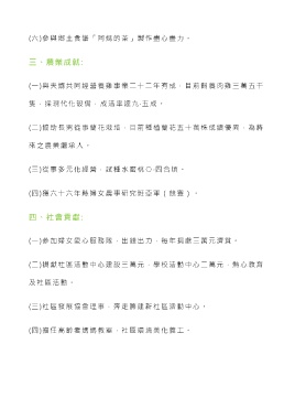 (一)參加婦女愛心服務隊,出錢出力,每年捐獻三萬元濟貧。
