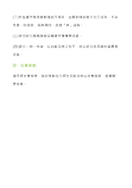 (二)所生產竹筍除鮮銷傳統市場外,並鑽研傳統筍干加工技術,不含 色素、防腐劑,風味獨特,自創「林」品牌。 (三)參加彰化縣精緻蔬菜競賽常獲優異成績。 (四)配合一鄉一特產,以自創品牌之筍干,熱心配合各項農特產展售 活 動 。 四、社會貢獻: 擔任婦女會理事,協助推動地 方婦女活動及熱心社會服務,甚獲鄰 里敬重。