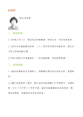 林美琴 姓 名 :林美琴 一、家庭管理: (一)育有三男一女,家庭生活幸福美滿,除長女外,均受高等教育。 (二)長女自幼罹患腦性麻痺,二十二年來含辛茹苦照顧有加,使先生 工作之餘無後顧之憂。 (三)與公婆同住並相處融洽,一家和樂融融,深值鄰里稱道。 二、家政指導: (一)協助組織家政班不遺餘力,鼓勵農村婦女參加家政活動,學習新 知 。 (二)擔任家政幹部十餘年,熱心協助家政雄廣工作不遺餘力,成績卓 著,於七十九年至八十四年年間,每年均獲績優家政班員殊榮,期 間參加烹飪、經驗發表等約名列前茅。