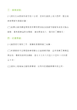 三、農業成就: (一)與先生共同耕作綠竹筍一公頃,並率先提供 土地六百坪,配合政 府辦理都市農園計劃。 (二)能學以致用將在家政班所學烹飪技能及自產竹筍製作成各式點心 銷售,提高農產品附加價值,增加家庭收入,每月約二萬餘元。 四、社會貢獻: (一)協助推行環保工作,榮獲社區優秀義工表揚。 (二)於農閒時不定期協助辦理愛心公益服務活動,並率領義工媽媽至 育幼院、養老院慰問及捐助,自七十九年八月至八十四年十月計達 三十次。 (三)提供土地做為公園和停車場,以利市民農園停車休閒之用。