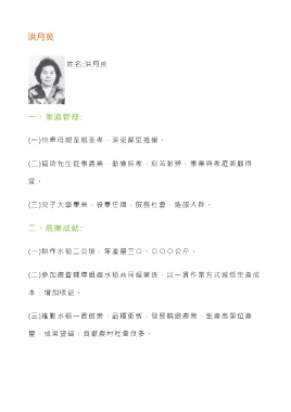 洪月英 姓 名 :洪月英 一、家庭管理: (一)侍奉母親至親至孝,深受鄰里推崇。 (二)協助先生從事農業,勤儉持家,刻苦耐勞,事業與家庭兼顧得 宜 。 (三)兒子大學畢業,役畢任職,服務社會,造服人群。 二、農業成就: (一)耕作水稻二公頃,年產量三 ○、○ ○ ○ 公 斤 。 (二)參加農會輔導組織水稻共同經營班,以一貫作業方式減低生產成 本,增加收益。 (三)推動水稻一貫做業,品種更新,發展精緻農業,生產高單位產 量,成果豐碩,貢獻農村社會良多。