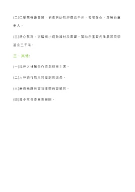 (二)仁愛慈善會會員,捐獻育幼院經費五千元,發場愛心、澤被幼童 老 人 。 (三)熱心教育,捐贈國小運動器材及圖書。贊助 余玉賢先生農業獎學 基金三千元。 三、其他: (一)現任大林鎮合作農場理事主席。 (二)大林鎮竹筍共同產銷班班長。 (三)嘉義縣體育會羽球委員會顧問。 (四)國小家長委員會顧問。