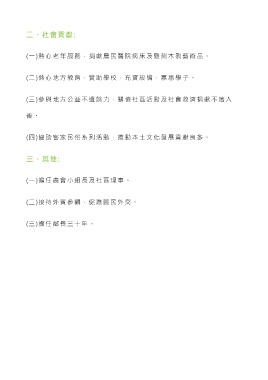 二、社會貢獻: (一)熱心老年服務,捐獻農民醫院病床及雕刻木製藝術品。 (二)熱心地方教育,贊助學校,充 實設備,嘉惠學子。 (三)參與地方公益不遺餘力,關懷社區活動及社會救濟捐獻不落人 後 。 (四)協助客家民俗系列活動,推動本土文化發展貢獻良多。 三、其他: (一)擔任農會小組長及社區理事。 (二)接待外賓參觀,促進國民外交。 (三)擔任鄰長三十年。