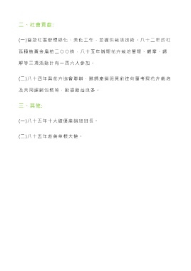 二、社會貢獻: (一)協助社區辦理綠化、美化工作,並提供栽培技術。八十二 年於社 區種植黃金扁柏二 ○ ○ 株,八十五年辦理花卉栽培管理、觀摩、講 解等三項活動計有一四六人參加。 (二)八十四年與花卉協會聯辦,邀請產銷班員前往荷蘭考察花卉栽培 及共同運銷包裝等,對提助益良多。 三、其他: (一)八十五年十大績優產銷班班長。 (二)八十五年赴美草根大使。
