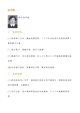曾月貴 姓 名 :曾月貴 一、家庭管理: (一)夫家有三兄弟,僅其夫婦留農,二十八年來任勞任怨在家侍奉三 個高齡之公婆。 (二)相夫教子,勤儉持家,受村人稱讚。 (三)種植花木,美化居住環境。於七十六及七十八年獲農家環境改善 表 揚 。 (四)利用插花設計,佈置居住空間,提高生活品質。 二、家庭指導: (一)參加家政班十五年,協助推行家政工作不遺餘力。領導家政班參 加班會競賽,成績優良。 (二)文武全能,為大寮鄉家政班的全能義指,七十八年當選家政楷 模 。