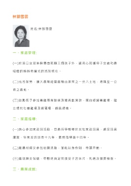 (一)熱心參加家政班活動,並將所學教導於其他家政班員,頗受班員