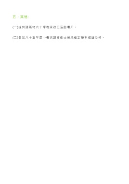 五、其他: (一)提供建築物六十坪為家政班活動場所。 (二)參加八十五年度中餐烹調技術士技能檢定學 科成績及格。
