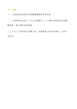 三、其他: (一)義務協助學術研究機關團體觀摩研習活動。 (二)提供魚池地區八 ○坪土地價值約二○ ○ 萬元免費提供政府開 闢道路,便利農村產業運輸。 (三)自八十四年起於埔霧公路,免費遍植花卉美化環境,並且不 求回報。