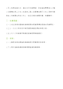 (五)採用直銷方式,建立自己的銷售網,目前擁有零售商七 ○點 (佔販售比例二 ○%)批發商二點(佔販售比例三 ○%)及軍中副 食站(佔販售比例五○%)。能完全解決銷售問題,殊屬難得。 二、社會貢獻: (一)成立澎湖地區畜牧廢棄資源共同處理場並組織共同處理班。 (二)一九九○年代表中華民國到韓國訪問的草根大使。 (三)七十八年曾獲本縣農民節畜牧類模範農民。 三、其他: (一)擔任澎湖地區畜牧廢棄資源共同處理班班經理。 (二)每年協助縣環保局辦理學生環保觀摩會。