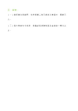 三、其他: (一)擔任警友會顧問,每年捐獻二萬元購買文康器材,貢獻己 力 。 (二)每年舉辦冬令救濟,急難訪察捐贈物資及金錢達十萬元以 上 。