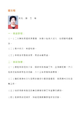 鍾玉梅 姓名:鐘 玉 梅 一、家庭管理: (一)二人肩挑家庭經濟重擔,扶養小姑長大成人,姑嫂間相處融 洽 。 (二)教子有方、家庭和樂。 (三)事親至孝勤儉持家,家庭幸福美滿。 二、家政指導: (一)擔任家政班長八年,協助家政推廣工作,並領導班員一六 ○ 名參加省縣鄉等各項活動,八十三年榮獲縣級表揚。 (二)擔任農漁村文化發展計畫推行委員會委員,推展農村文化發 展工作。 (三)協助高齡者生活改善及營養保健工作並擔任講師。 (四)提供家政班場所,供給班員開會辦理研習活動。