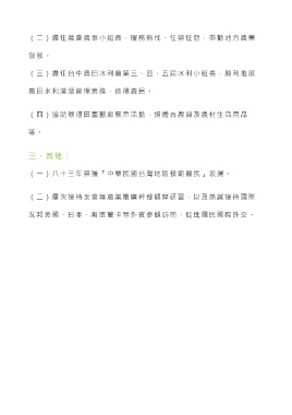 (二)擔任農會農事小組長,服務熱忱、任勞任怨,帶動地方農業 發 展 。 (三)擔任台中農田水利會第三、四、五屆水利小組長,順利推展 農田水利灌溉管理業務,造福農民。 (四)協助辦理田園藝廊展示活動,捐贈古農具及農村生活用品 等 。 三 、 其他: (一)八十三年榮獲「中華民國台灣地區模範農民」表揚。 (二)屢次接待友會等農業推廣幹部觀摩研習,以及熱誠接待國際 友邦美國、日本、斯底蘭卡等外賓參觀訪問,促進國民國際外交。