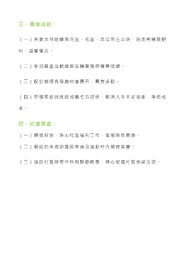 三、農業成就: (一)夫妻共同經營落花生、毛豆、西瓜等三公頃,施用有機質肥 料,品質優良。 (二)參加農產品精緻蔬菜競賽獲得優異成績。 (三)配合辦理各種農特產展示、展售活動 。 (四)帶領家政班員組成農忙互助班,解決人手不足現象,降低成 本 。 四、社會貢獻: (一)樂善好施,熱心社區福利工作,曾獲縣長表揚。 (二)捐送白米救助貧困家庭及協助村內婚喪喜慶。 (三)協助社區辦理中秋節聯歡晚會,熱心促進社區情感交流。