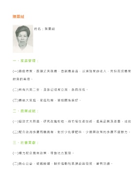 (一)協助丈夫務農,研究改進柑桔、綠竹筍生產技術,提高品質及產量,成效優異。