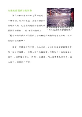 先進的經營參訪的對象 陳女士在金線蓮生產方面的成功, 不僅增加了農友的收益,當選為優良農 業專業人員,也是農業經營的楷模和參 觀訪問的對象, 89 年間來台參加 「植物組織培養與種苗繁殖」研習會的各國農業專家及官員,就曾 到她的農場觀摩。 陳女士於農場工作之餘,熱心公益,於 88 年榮獲教育部頒贈 的「深耕服務獎」;他加入南投縣婦聯會,長期投入社區服務建設 義 工 ,協助獨居老人。於 921 地震時,加入慈濟會救災工作,盡 心盡力,深獲地方好評。