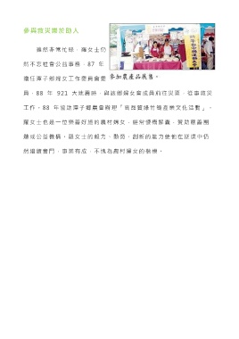 參與救災樂於助人 雖然非常忙碌,羅女士仍 然不忘社會公益事務, 87 年 擔任潭子鄉婦女工作委員會委 員 , 88 年 921 大地震時,與該鄉婦女會成員前往災區,從事救災 工 作 。 88 年協助潭子鄉農會辦理「高品質綠竹筍產業文化活動」。 羅女士也是一位樂善好施的農村婦女,經常慷概解囊,贊助慈善團 體或公益機構。羅女士的 毅力、勤勞、創新的能力使他在逆境中仍 然繼續奮鬥,事業有成,不愧為農村婦女的楷模。