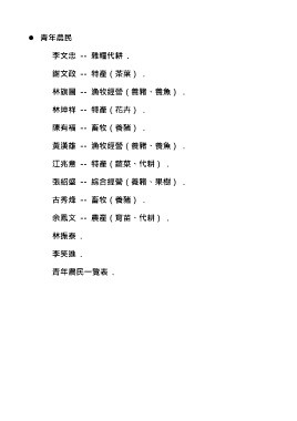 青年農民 李文忠 -- 雜糧代耕 . 謝文政 -- 特產(茶葉) . 林旗圖 -- 漁牧經營(養豬、養魚) . 林坤祥 -- 特產(花卉) . 陳有褔 -- 畜牧(養豬) . 黃漢雄 -- 漁牧經營(養豬、養魚) . 江兆意 -- 特產(蔬菜、代耕) . 張紹盛 -- 綜合經營(養豬、果樹) . 古秀烽 -- 畜牧(養豬) . 余鳳文 -- 農產(育苗、代耕) . 林振泰 . 李笑進 . 青年農民一覽表 .