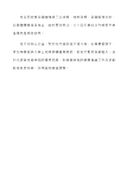 他目前經營茶園面積達二公頃餘,極具規模,茶園管理良好, 以栽種鐵觀音茶為主,由於表現傑出,七十四年蒙台北市楊前市長 金欉先生親往訪問。 他平日熱心公益,對於地方建 設從不落人後,在農會協調下, 率先無償提供大筆土地供開闢產業道路,對地方繁榮貢獻極大。此 外也是當地農事班的優秀班員,對農會辦理的農業推廣工作及活動 配合更是熱衷,深得當地鄰里讚譽。