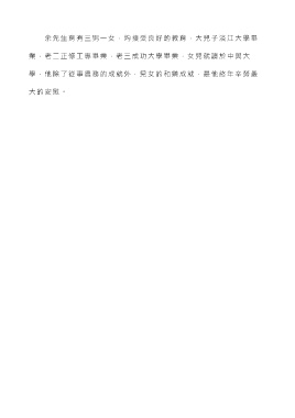 余先生育有三男一女,均接受良好的教育,大兒子淡江大學畢 業,老二正修工專畢業,老三成功大學畢業,女兒就讀於中興大 學,他除了從事農務的成就外,兒女的和樂成就,是他終年辛勞最 大的安慰。