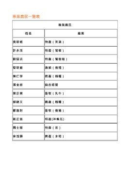 專業農民一覽表 專業農民 姓 名 產 業 吳新城 特產(茶葉) 許永茂 特產(葡萄) 劉居清 特產(葡萄柚) 蔡新巖 漁業(養殖) 陳仁學 農產(雜糧) 潘金宙 綜合經營 陳正男 畜牧(乳牛) 柳錦文 農產(雜糧) 鄭進財 畜牧(養豬) 施正義 特 產 (洋香瓜) 周士樹 特產(茶) 余加獅 農產(水稻)