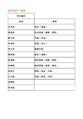 青年農民一覽表 青年農民 姓 名 產 業 古秀烽 畜牧(養豬) 張紹盛 綜合經營(養豬、果樹) 謝文政 特產(茶葉) 林坤祥 特產(花卉) 李文忠 雜糧代耕 陳有褔 畜牧(養豬) 黃漢雄 漁牧經營(養豬、養魚) 林旗圖 漁牧經營(養豬、養魚) 余鳳文 農產(育苗、代耕) 江兆意 特產(蔬菜、代耕) 林振泰 李笑進
