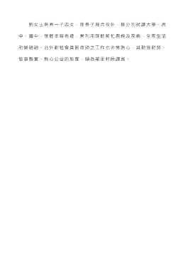 劉女士育有一子四女,除長子服兵役外,餘分別就讀大學、高 中、國中,個個孝順有禮,常利用課餘幫忙農務及家務,全家生活 和樂融融。此外對社會貧困救助之工作也非常熱心,其勤儉耐勞、 做事踏實、熱心公益的態度,頗為鄰里村民讚賞。