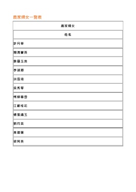 農家婦女一覽表 農家婦女 姓 名 許月華 周馮蘭英 詹羅玉英 李淑卿 洪雪鴻 吳秀琴 柯柳春雪 江鄭桂花 楊張繡玉 劉月英 高碧蓮 梁阿美