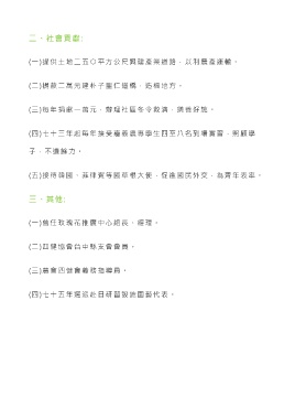 二、社會貢獻: (一)提供土地二五○平方公尺興建產業道路,以利農產運輸。 (二)捐款二萬元建朴子里仁道橋,造福地方。 (三)每年捐獻一萬元,辦理社區冬令救濟,樂善好施。 (四)七十三年起每年接受嘉義農專學生四至八名到場實習,照顧學 子,不遺餘力。 (五)接待韓國、菲律賓等國草根大使,促進國民外交,為青年表率。 三、其他: (一)曾任玫瑰花推廣中心組長、經理。 (二)四健協會台中縣支會會員。 (三)農會四健會義務指導員。 (四)七十五年選派赴日研習設施園藝代表。