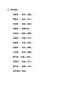 青年農民 張穎發 -- 畜牧(養豬) . 陳豐益 -- 畜牧(乳牛) . 邱明春 -- 漁業(養殖) . 林隆昌 -- 雜糧代耕 . 蔡志峰 -- 漁業(養殖) . 邱清鈺 -- 特產(花卉) . 蔡慶蒼 -- 特產(蔬菜) . 蔡國泰 -- 畜牧(養豬) . 方瑞清 -- 畜牧(養豬) . 劉文鎮 --特產(茶葉) . 何昭明 -- 特產(花卉) . 陳光龍 -- 農產(水稻) . 青年農民一覽表 .