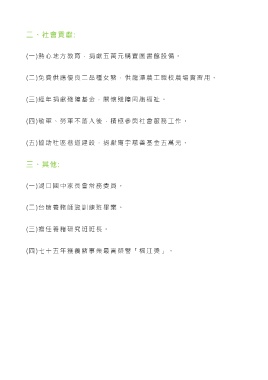 二、社會貢獻: (一)熱心地方教育,捐獻五萬元購置圖書館設備。 (二)免費供應優良二品種女豬,供龍潭農工職校農場實習用。 (三)經年捐獻殘障基金,關懷殘障同胞福祉。 (四)敬軍、勞軍不落人後,積極參與社會服務工作。 (五)協助社區巷道建設,捐獻廟宇慈善基金五萬元。 三、其他: (一)湖口國中家長會常務委員。 (二)台糖養豬師資訓練班畢業。 (三)擔任養豬研究班班長。 (四)七十五年獲養豬事業最高榮譽「福江獎」。