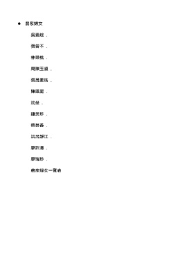 農家婦女 吳素趁 . 張曾不 . 林榮桃 . 周陳玉盞 . 張呂素桃 . 陳鳳麗 . 沈坐 . 鍾美珍 . 蔡芸香 . 洪呂靜江 . 廖許清 . 廖瑞珍 . 農家婦女一覽表