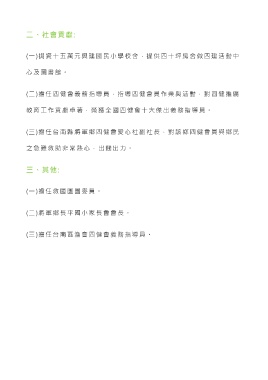 二、社會貢獻: (一)捐資十五萬元興建國民小學校舍,提供四十坪房舍做四建活動中 心及圖書館。 (二)擔任四健會義務指導員,指導四健會員作業與活動,對四健推廣 教育工作貢獻卓著,榮獲全國四健會十大傑出義務指導員。 (三)擔任台南縣將軍鄉四健會愛心社 副社長,對該鄉四健會員與鄉民 之急難救助非常熱心,出錢出力。 三、其他: (一)擔任救國團團委員。 (二)將軍鄉長平國小家長會會長。 (三)擔任台南區漁會四健會義務指導員。