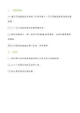 二、社會貢獻: (一)擔任四健會義務指導員六年並榮獲七十五年四健會義務指導員服 務 獎 。 (二)七十五年省級經驗發表會競賽冠軍。 (三)擔任該鎮國中、國小自然科學 (園 藝 )教學講師,並提供農場實習 與講解。 (四)自行攝製病蟲害幻燈片記錄,供教學用。 三、其他: (一)接受農村青年農業專業訓練花卉班五個月訓練結業。 (二)七十六年選派為赴日草根大使 。 (三)核心農民師資訓練結業。