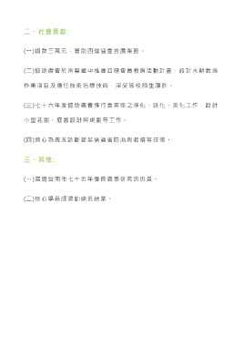 二、社會貢獻: (一)捐款三萬元,贊助四健協會推廣業務。 (二)協助農會於南寧國中推廣四健會員教育活動計畫,設計水耕栽培 作業項目及擔任技術指導技術,深受該校師生讚許。 (三)七十六年度協助農會推行喜東里之淨化、綠化、美化工作,設計 小型花園、庭園設計與規劃等工作。 (四)熱心為農友診斷蔬菜病蟲害防治與栽培等技術。 三、其他: (一)當選台南市七十五年優良農 事研究班班員。 (二)核心學員師資訓練班結業。