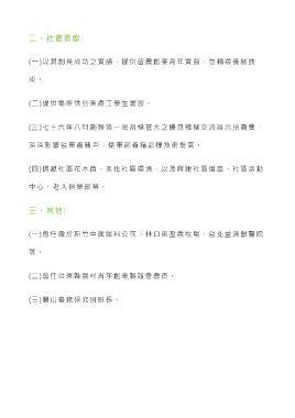 二、社會貢獻: (一)以其創業成功之實績,提供留農創業青年實習,並輔導養豬技 術 。 (二)提供場所供台東農工學生實習。 (三)七十六年八月創辦第一屆規模甚大之優良種豬交流展示拍賣會, 深深影響台東養豬戶,使東部養豬品種技術提高。 (四)捐獻社區花木苗、美化社區環境,以及興建社區道路、社區活動 中心、老人俱樂部等。 三、其他: (一)曾任職於新竹中興飼料公司、林口東盈農牧場、台北益源獸醫院 等 。 (二)曾任台東縣農村青年創業聯誼會會長。 (三)關山養豬研究班班長。