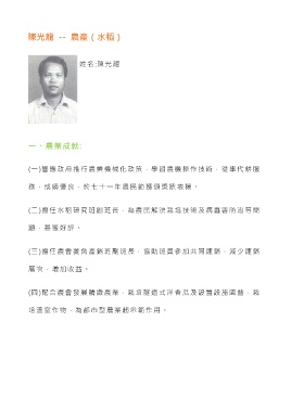陳光龍 -- 農產(水稻) 姓 名 :陳光龍 一、農業成就: (一)響應政府推行農業機械化政策,學習農機操作技術,從事代耕服 務,成績優良,於七十一年農民節獲頒獎狀表揚。 (二)擔任水稻研究班副班長,為農民解決栽培技術及病蟲害防治等問 題,甚獲好評。 (三)擔任農會菱角產銷班副班長,協助班員參加共同運銷,減少運銷 層次,增加收益。 (四)配合農會發展精緻農業,栽培隧道式洋香瓜及設置設施園藝,栽 培溫室作物,為都市型農業起示範作用。