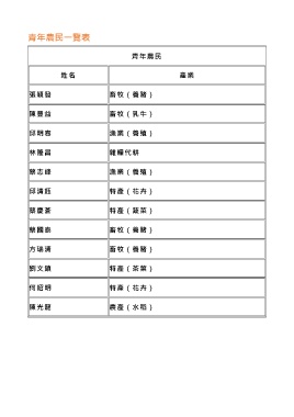 青年農民一覽表 青年農民 姓 名 產 業 張穎發 畜牧(養豬) 陳豐益 畜牧(乳牛) 邱明春 漁業(養殖) 林隆昌 雜糧代耕 蔡志峰 漁業(養殖) 邱清鈺 特產(花卉) 蔡慶蒼 特產(蔬菜) 蔡國泰 畜牧(養豬) 方瑞清 畜牧(養豬) 劉文鎮 特產(茶葉) 何昭明 特產(花卉) 陳光龍 農產(水稻)