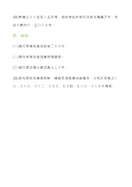 (四)民國三十七至四十五年間,協助衛生所預防注射及醫護工作,受 益人數約六、五 ○ ○ 人 次 。 四、其他: (一)擔任家事改進班班長二十六年。 (二)擔任家事改進班義務指導員。 (三)擔任婦女會小組召集人二十年。 (四)參加家政推廣教育縣、鄉級各項競賽成績優良,分別於民國五十 六、六十六、七十二、七十三、七十四、七十六、七十七年得獎。