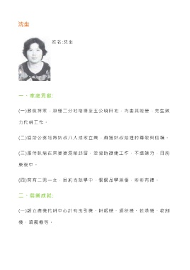 沈坐 姓 名 :沈 坐 一、家庭貢獻: (一)勤儉持家,原僅二分地增購至五公頃田地,均由其經營,先生致 力代耕工作。 (二)協助公婆培育姑叔八人成家立業,頗獲姑叔妯娌的尊敬與信賴。 (三)服侍臥病在床婆婆湯藥起居,並協助復建工作,不遺餘力,目前 康復中。 (四)育有二男一女,目前尚就學中,個個品學兼優,彬彬有禮。 二、農業成就: (一)設立農機代耕中心計有曳引機、耕耘機、插秧機、乾燥機、收割 機、噴霧機等。
