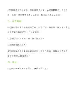 (二)除自耕作五公頃外,另代耕四 ○公頃,烘乾稻穀四八、 ○○○ 噸,綠肥、油菜作物推廣四三公頃,代收割稻穀五三公頃。 三、社會貢獻: (一)熱心協助家政推廣教育工作,配合公所、衛生所、婦女會、學校 辦理家事改進班活動,且成績優良。 (二)熱心協助村民婚、喪、喜、慶工作。 (三)濟助貧困計五戶。 (四)發動家政班員重陽節敬老活動,並製作壽糕、壽麵為老人祝壽, 配合辦理老人自強活動。 四、其他: (一)參加家事改進班十三年,擔任班長九年。