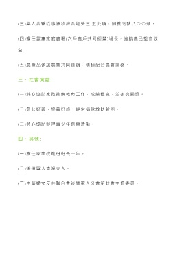 (三)與人合夥從事漁牧綜合經營三 ‧五公頃,飼養肉豬八 ○ ○ 頭 。 (四)擔任豐富家庭農場(六戶農戶共同經營 )場長,協助農民提高收 益 。 (五)農產品參加農會共同運銷,積極配合農會業務。 三、社會貢獻: (一)熱心協助家政推廣教育工作,成績優良,並多次受獎。 (二)急公好義,樂善好施,經常捐款救助貧困。 (三)熱心協助辦理青少年育樂活動。 四、其他: (一)擔任家事改進班班長十年。 (二)後備軍人青溪夫人。 (三)中華婦女反共聯合會後備軍人分會第廿會主任委員。