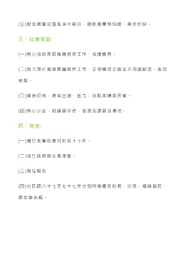 (三)配合農會設置各項示範田,創新農業新知識,頗受好評。 三、社會貢獻: (一)熱心協助家政推廣教育工作,成績優異。 (二)致力推行農事推廣教育工作,並領導成立蔬菜共同運銷班,表現 卓 越 。 (三)樂善好施,時常出錢、出力,扶助家境貧困者。 (四)熱心公益,組織識字班,並接洽講師及場地。 四、其他: (一)擔任家事改進班班長十七年。 (二)現任該鄉婦女會理事。 (三)曾任鄰長 (四)自民國六十七至七十七年分別榮獲優秀班員、班長、模範農民、 婦女等表揚。