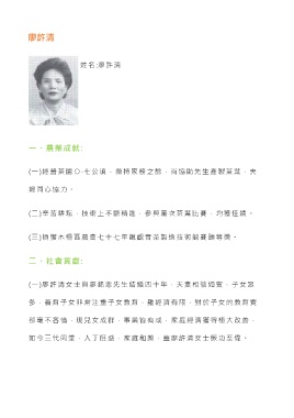廖許清 姓 名 :廖許清 一、農業成就: (一)經營茶園○ ‧ 七公頃,操持家務之餘,尚協助先生產製茶葉,夫 婦同心協力。 (二)辛苦耕耘,技術上不斷精進,參與屢次茶葉比賽,均獲佳績。 (三)頃獲木柵區農會七十七年鐵觀音茶製造技術競賽頭等獎。 二、社會貢獻: (一)廖許清女士與廖銘忠先生結婚四十年,夫妻相敬如賓,子女眾 多,養育子女非常注重子女教育,雖經濟有限,對於子女的教育費 卻毫不吝惜,現兒女成群,事業皆有成,家庭經濟獲得極大改善, 如今三代同堂,人丁旺盛,家庭和樂,蓋廖許清女士厥功至偉。