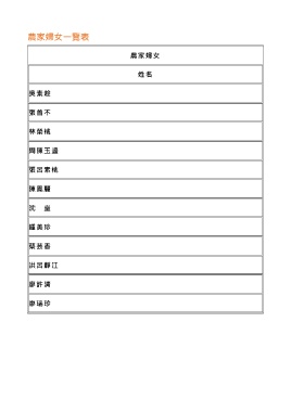 農家婦女一覽表 農家婦女 姓 名 吳素趁 張曾不 林榮桃 周陳玉盞 張呂素桃 陳鳳麗 沈 坐 鍾美珍 蔡芸香 洪呂靜江 廖許清 廖瑞珍