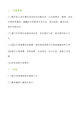 二、社會貢獻: (一)擔任核心青年農民柑桔研究班副班長,以所學專長 、學識、技術 定期辦理講習,灌輸新的經營理念及方法,提高品質,增加收益, 著有卓越成就。 (二)擔任共同委託經營班副班長,接受委託代耕,解決農村勞力不 足 。 (三)擔任四健會義務指導員,協助辦理農業及四健會推廣教育工作。 (四)擔任社區理事,爭取經費,改善環境,美化社區,提高生活品 質 。 (五)救助貧困兒童婦老。 三、其他: (一)擔任四健會義務指導員七年。 (二)農林廳核心農家記帳戶。