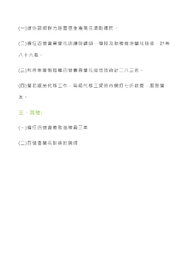 (一)提供該鄉群力慈善基金兩萬元濟助鄉民。 (二)擔任四健會員蘭花訓練班 講師,傳授及指導栽培蘭花技術,計有 八十六名。 (三)利用寒暑假指導四健會員蘭花栽培技術計二八三名。 (四)蘭花瓶苗代移工作,每瓶代移工資照市價打七折收費,服務蘭 友 。 三、其他: (一)擔任四健會義務指導員三年 (二)四健會蘭花訓練班講師