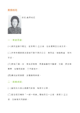 黃吳桂花 姓 名 :黃吳桂花 一、家庭貢獻: (一)與先生胼手胝足,從原有 ○ ‧ 五公頃,目前擁有四公頃良田。 (二)斥奉年邁婆婆及車禍行動不良的公公,無怨言。妯娌相處,情同 手 足 。 (三)育有三男一女,受良好教育,長男準備考中醫師,次男、長女藥 專畢,在醫院服務,三子服役中。 (四)養成記帳習慣,妥善運用金錢。 二、農業成就: (一)協助先生設立農機代耕隊,每期十公頃。 (二)配合稻田轉作「一鄉一特產」種植西瓜一公頃、青蔥 ○ ‧ 五 公 頃,並辦理共同運銷。